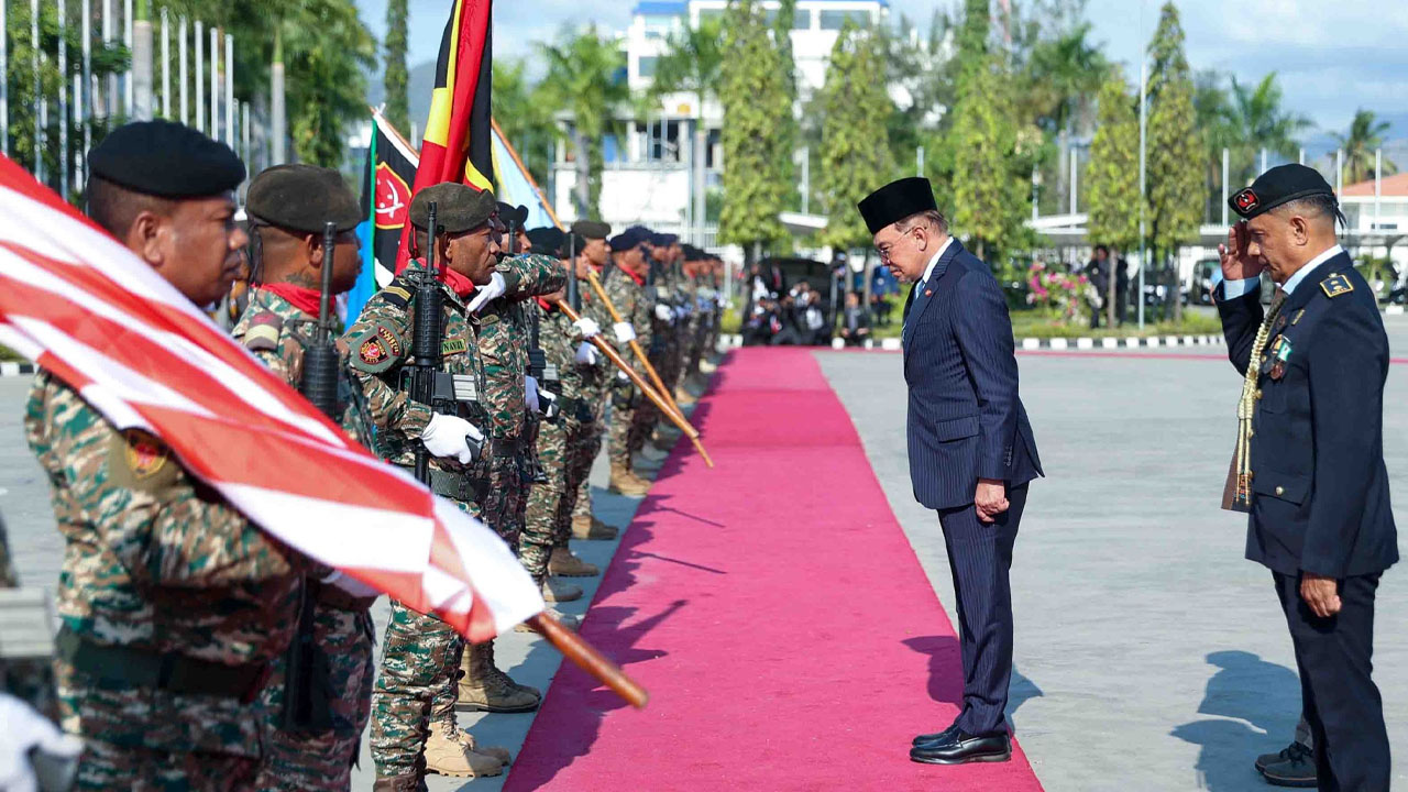 PM Anwar Ibrahim saat memberikan penghormatan kepada bendera Timor-Leste yang dipegang oleh seorang anggota militer Timor-Leste dalam upacara kenegaraan penyambutan. Photo: Media GPM