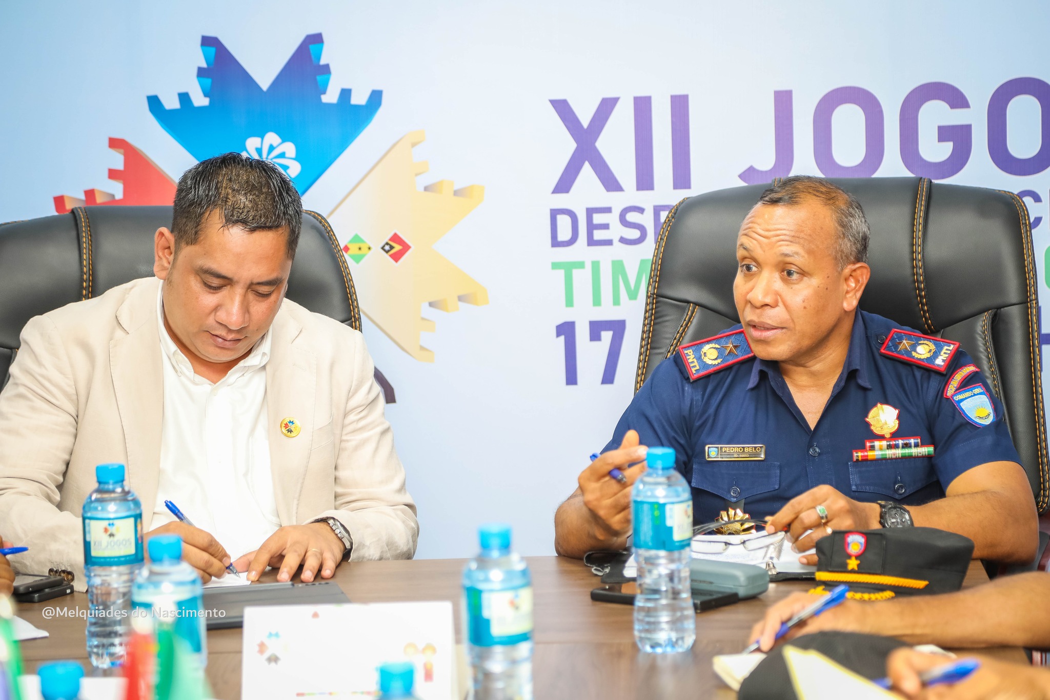 Koordenador Jeral Eventos XII Jogos Desportivos CPLP 2025 atual Sekretariu Estadu Arte no Kultura, Jorge Soares Cristovão no Segundu Komandante Jeral PNTL, Komisariu Pedro Belo iha inkontru kordenasaun. Photo: Media PNTL.